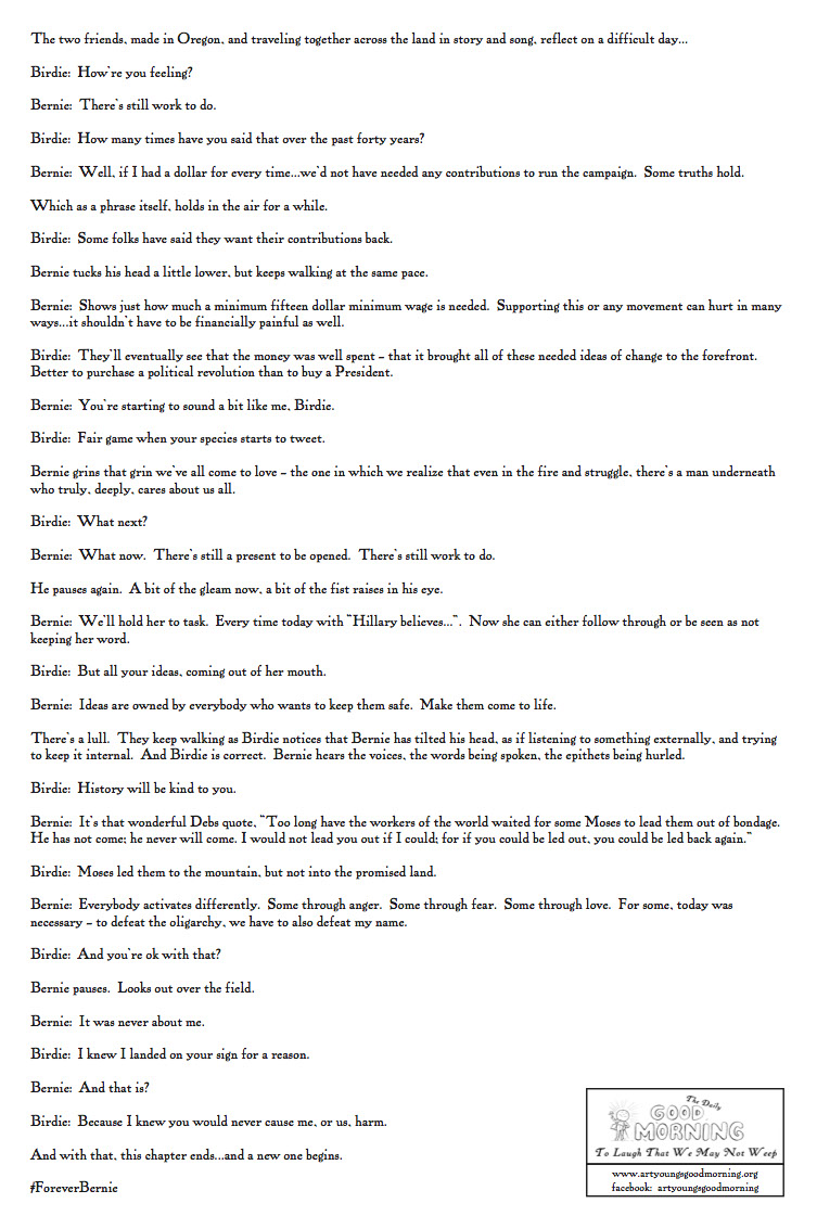 On July 13th, 2016, in response to Bernie’s appearance in New Hampshire, along side his opponent, we posted this image and the following story as The Daily Good Morning. Millions of views and comments later, “Birdie & Bernie: A Conversation” is now a part of the Bernie lore.